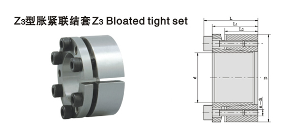Z3型脹緊套特性: Z3型脹緊內外錐環用內六角螺栓擰緊,能傳遞較大載荷,并且一個錐環上有拆卸螺紋孔;Z3型結合面較長,對中性好,適用于旋轉精度要求較高和傳遞大載荷的場合。